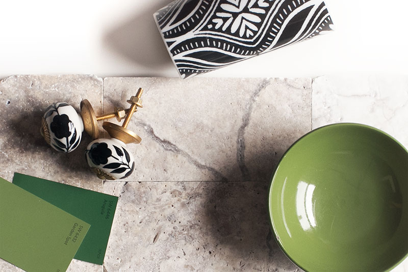 Travertine Tile with Black, White, Gold, and Vivid Green Accents