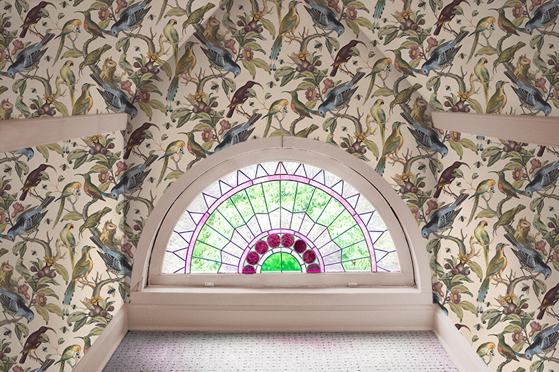 Rainbow Room, Milton & King Ornithology Wallpaper, Stained Glass Window, Pink Painted Trim
