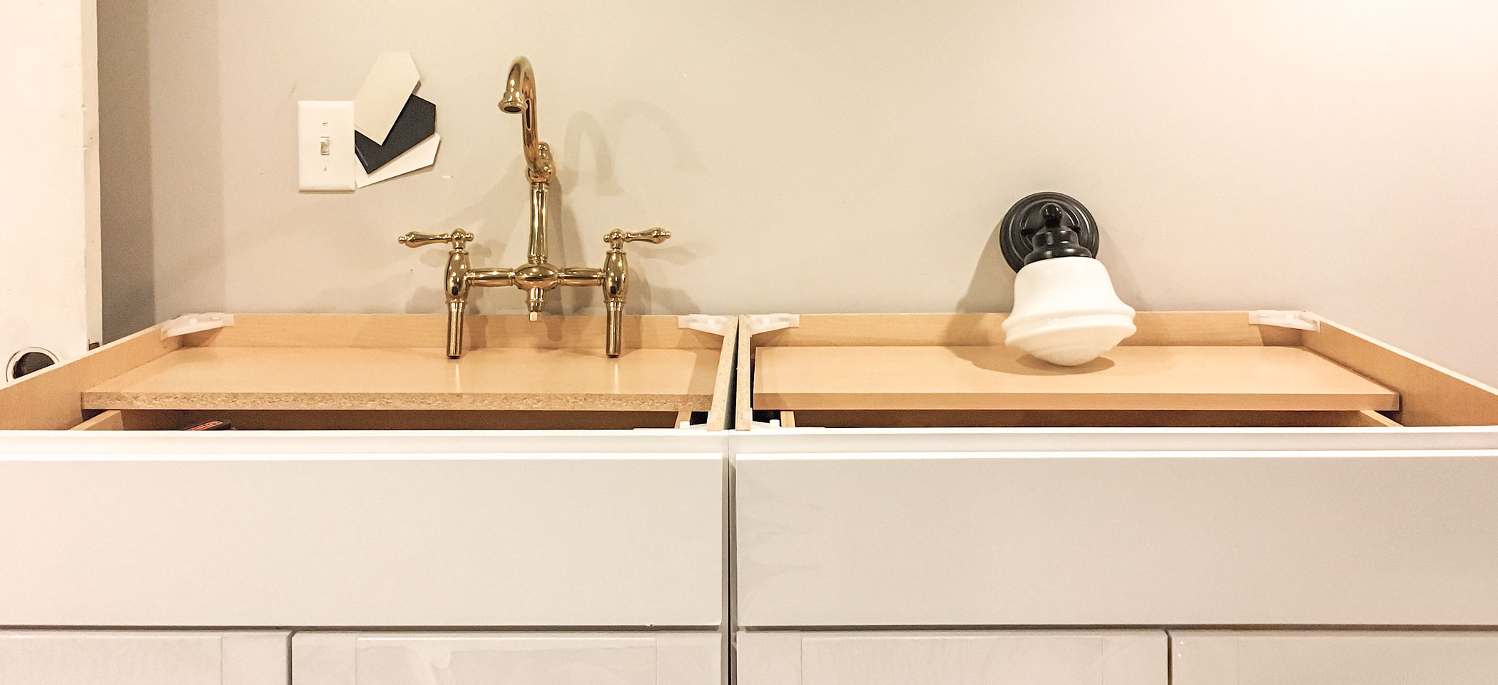 Stock Cabinets, Brass Faucet, Schoolhouse Sconce