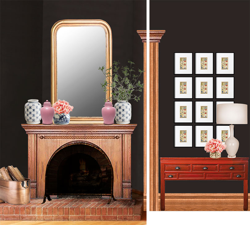 Photoshop Mockup: Louis-Phillipe Mirror Above Fireplace, Framed Grid of Art Above Red Console | Making it Lovely